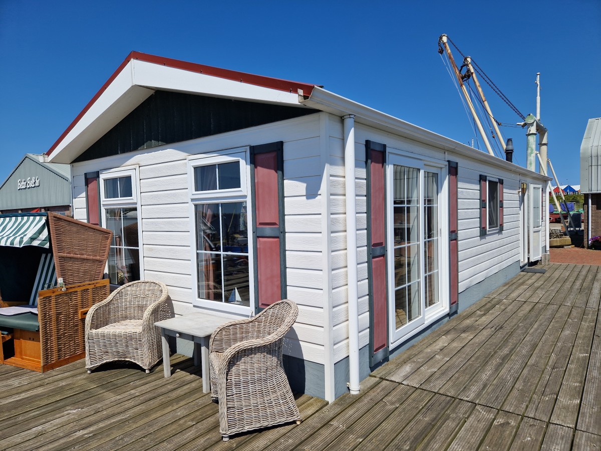 Houten huisje op de Pier van LauwersmeerPlezier!Keukentje met oven en koelkast, kookplaat.Zithoekje met uitzicht.2 perso... Lees meer..